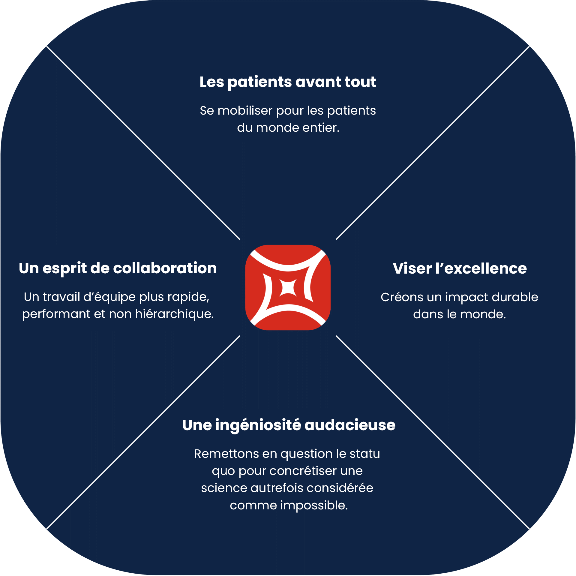 “Notre organisation rassemble des personnes extraordinaires, talentueuses et passionnées. Et s’il y a une chose que vous découvrirez rapidement, c’est que nous avons la conviction profonde de pouvoir améliorer la vie des patients et que nous accomplissons quelque chose de véritablement unique.”